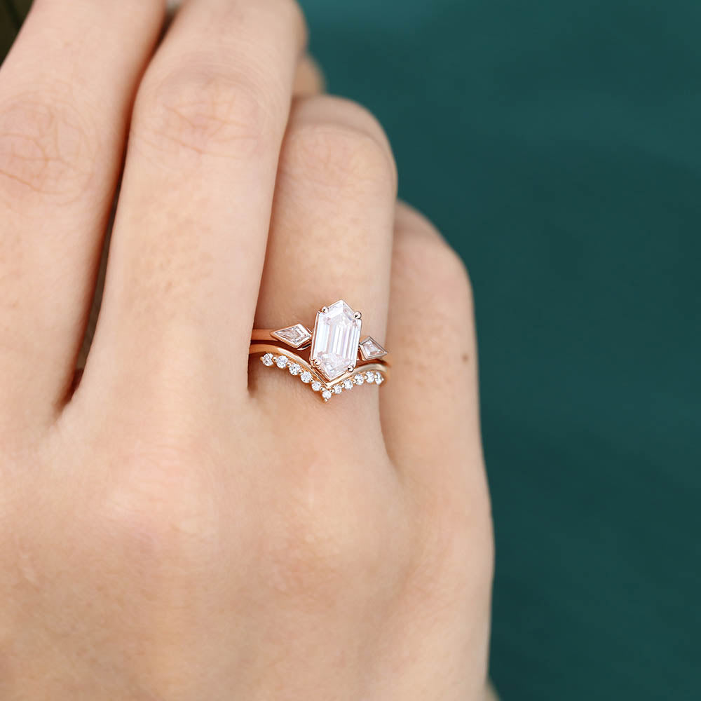 Elongated Hexagon Moissanite engagement ring set Unique Rose gold engagement ring Kite cut Diamond Wedding ring Promise Anniversary ring