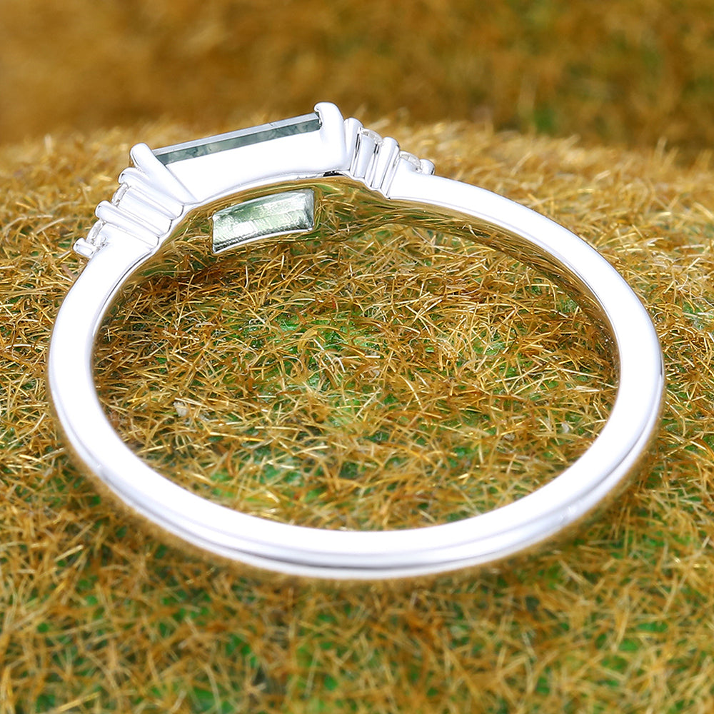 East West Baguette Cut Moss Agate Engagement Ring Art Deco Inspired Ring