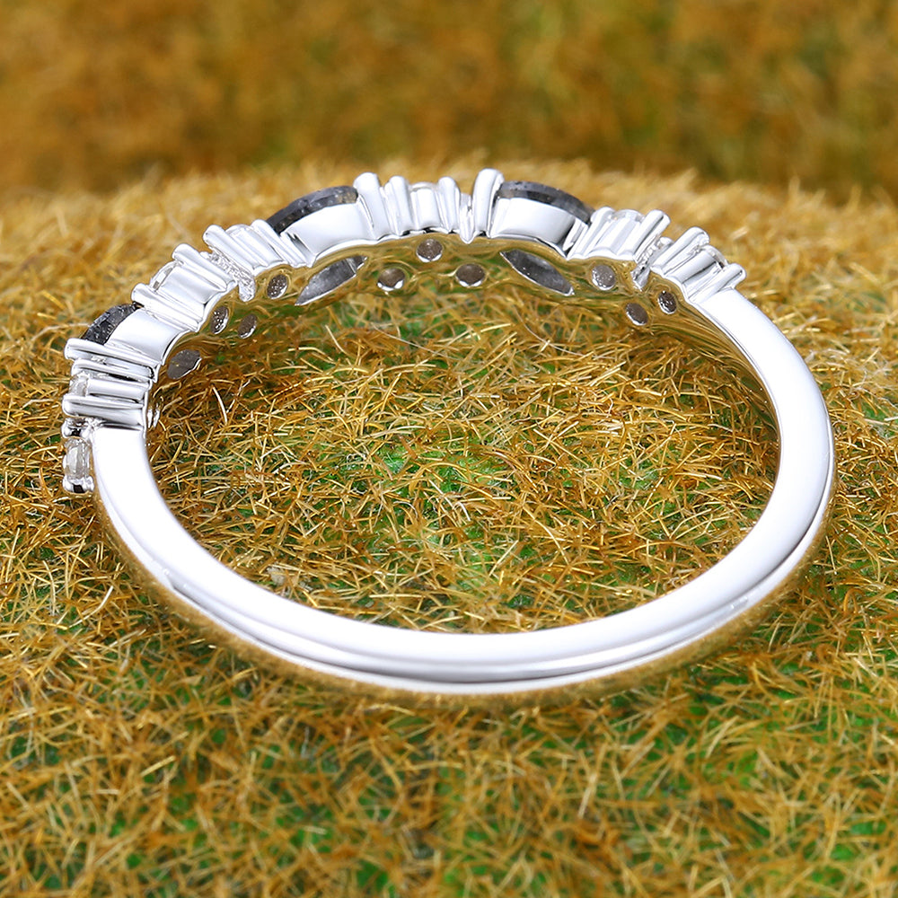 Marquise Black Rutilated Quartz & Round Moissanite Wedding Band Anniversary Ring