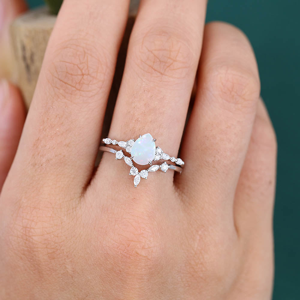 Unique Pear shaped Opal engagement ring set vintage white gold bridal ring Marquise cut Diamond ring Wedding Promise Anniversary ring set